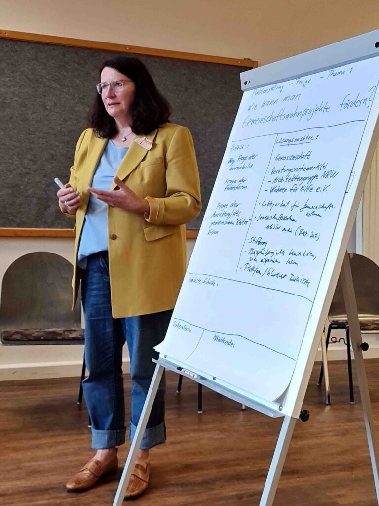 Am Nachmittag ging es es bei einem der Thementische um Fragen rund um ‚Gemeinschaftliches Wohnen‘. Und das höchst konkret: am Ende des Nachmittags hatte sich eine Gruppe gebildet, die das Thema in kleiner Runde weiterverfolgen und vertiefen möchte. Ein Treffen steht für Ende Oktober an. Als erster Schritt ist das Erstellen eines Internetauftritts zum Thema ‚Gemeinschaftliches Wohnen in Soest‘ geplant, dort sollen bereits existierende Projekte gezeigt werden und zum Nachahmen inspirieren.