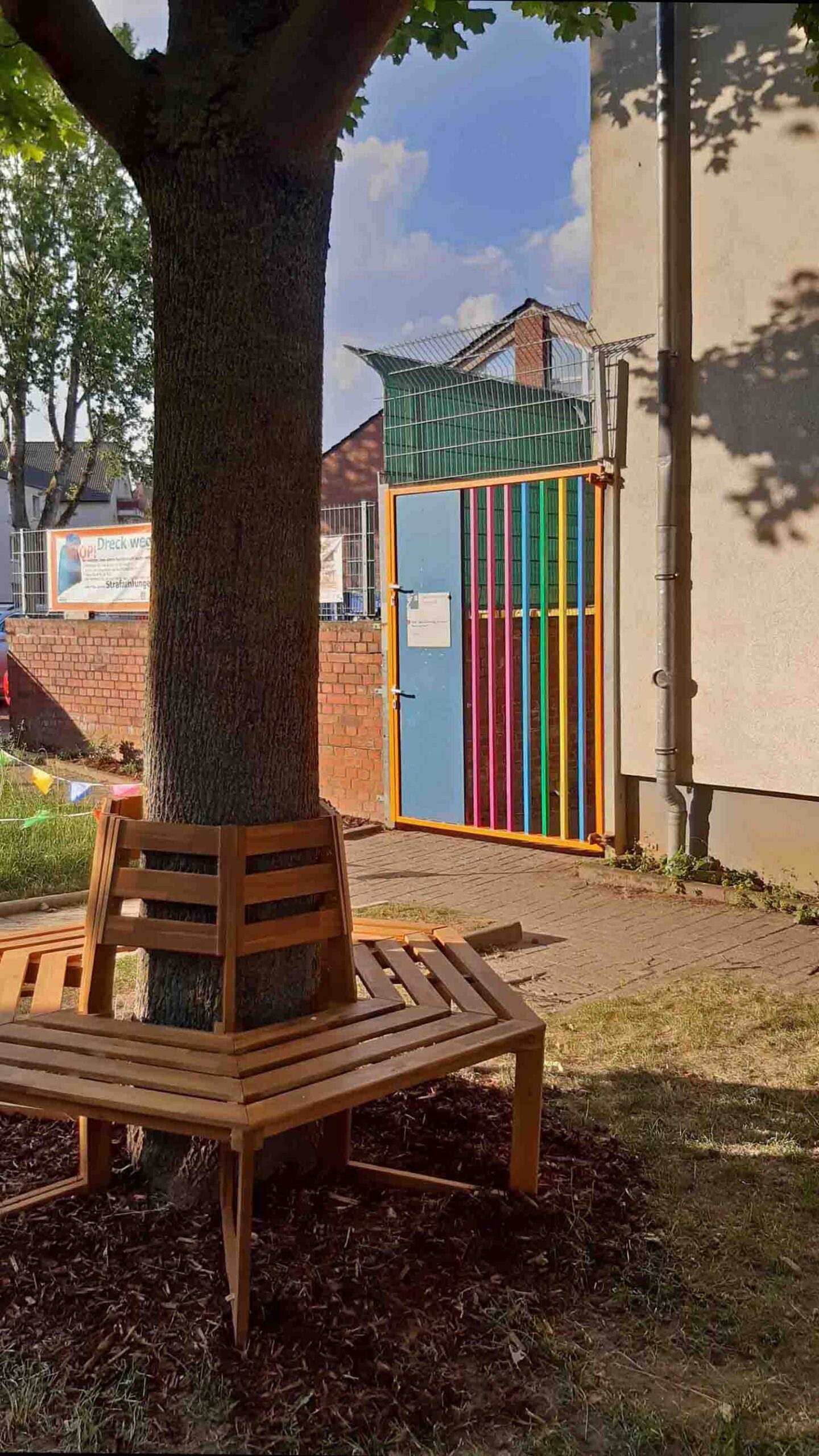 Die Maßnahmen sind ein farbenfroher Anstrich für das Eingangstor, das Pflanzen von blühenden und duftenden Kletterpflanzen rund um das Eingangstor, das Einsähen einer Bienenblumenwiese sowie eine Baumbank. Natürlich alles in gemeinschaftlicher Arbeit!